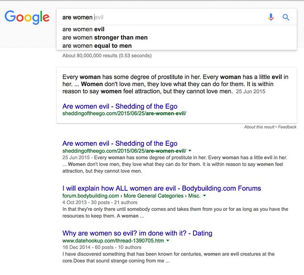Artikel von Carole Cadwalladr im Guardian hat jüngst (4.12.16) rassistische und sexistische Suchvorschläge bei Google aufgedeckt. Die Algorithmen erkennen Propaganda nicht. Screenshot aus dem Guardian: