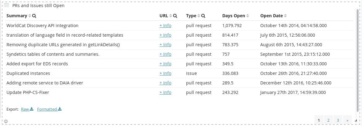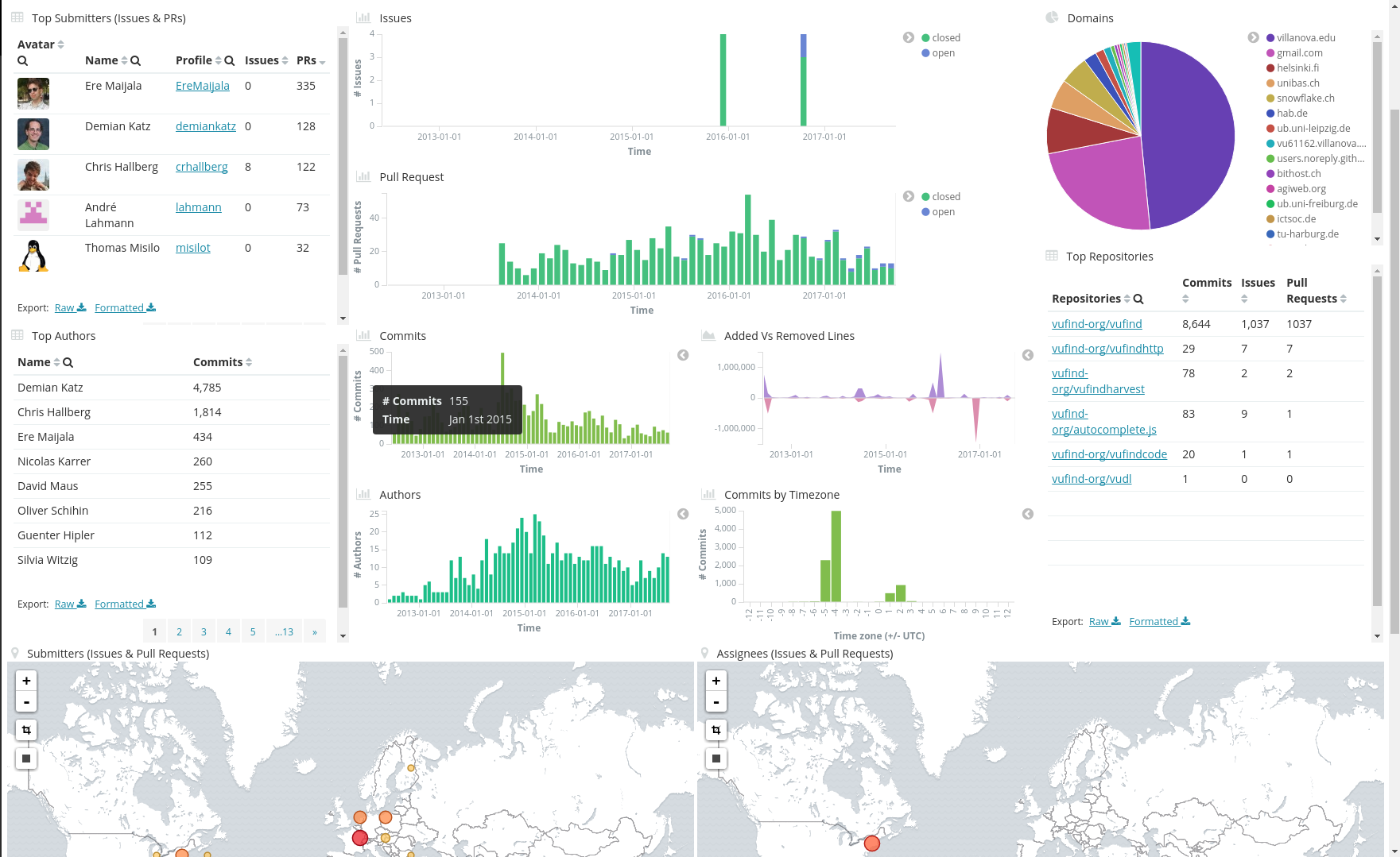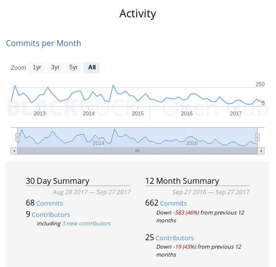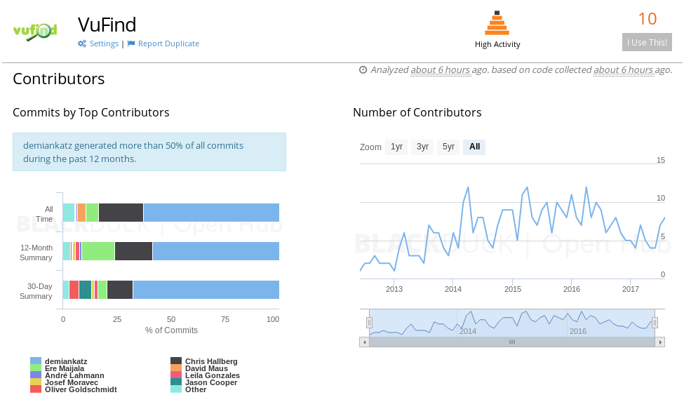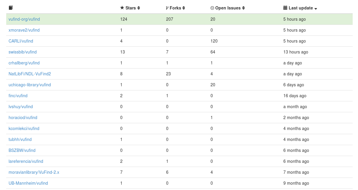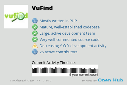VuFind selbst verweist auf die Statistiken von Open Hub der Sicherheitsfirma Black Duck und hat unten rechts im Footer der Webseite ein Widget eingebaut.